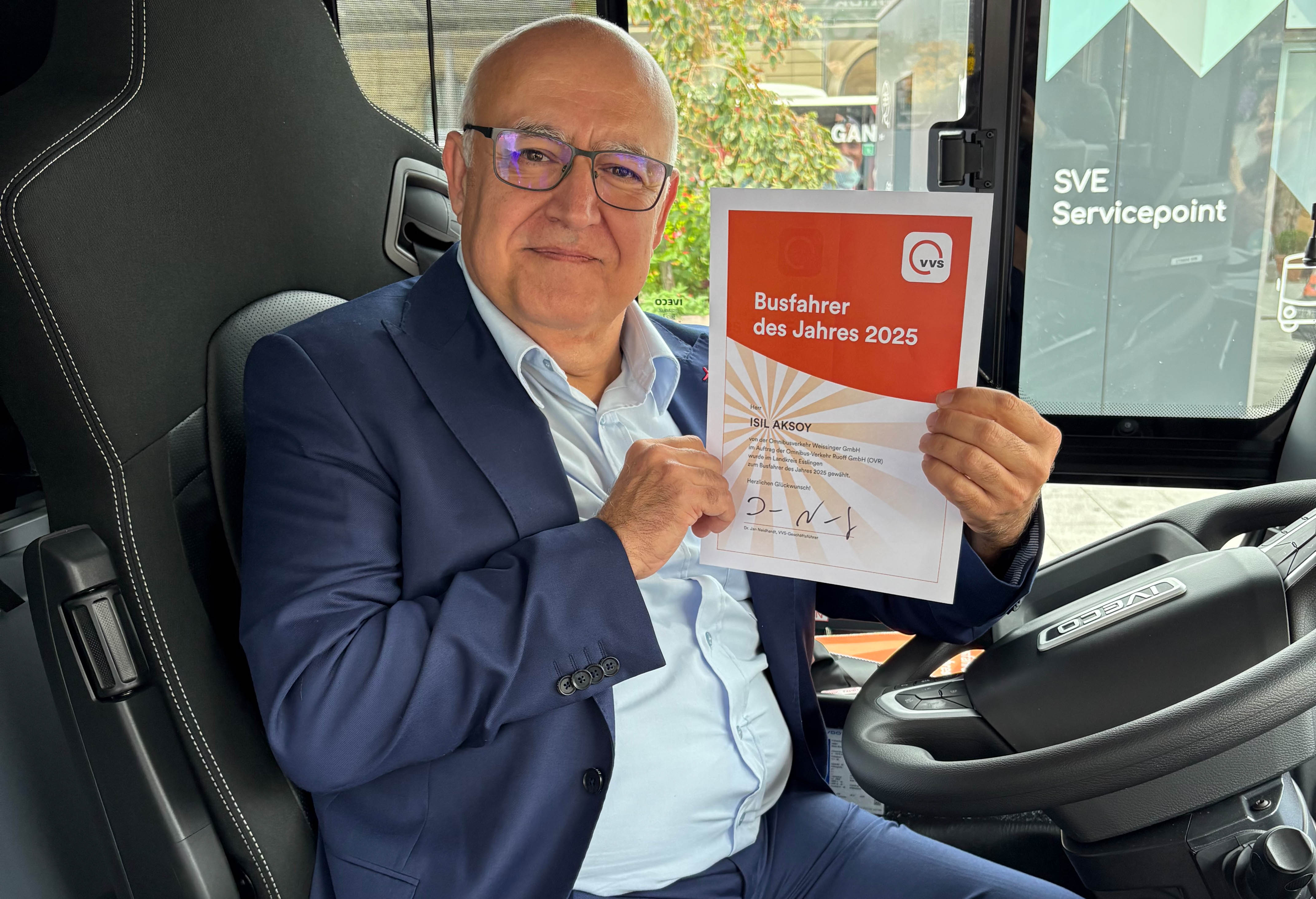 Ob ein freundliches Lächeln, ein lockerer Spruch oder aufmunternde Worte – Isil Aksoy von der Firma Weissinger ist weit mehr als „nur“ Busfahrer: Er ist ein täglicher Begleiter, der seinen Fahrgästen den Alltag versüßt. Für seine große Freundlichkeit, Umsicht und seinen Humor wurde der 57-jährige nun von den Fahrgästen zum Busfahrer des Jahres 2025 im Landkreis Esslingen gewählt. Seine Fahrgäste beschreiben ihn zudem als immer hilfsbereit. Besonders geschätzt wird, dass er sich Zeit nimmt, auf die Menschen einzugehen: „Man freut sich jedes Mal, wenn er der Fahrer ist. Er fährt sicher und sehr umsichtig! Er ist einfach der BESTE!“, so ein Fahrgast und Fan von ihm.