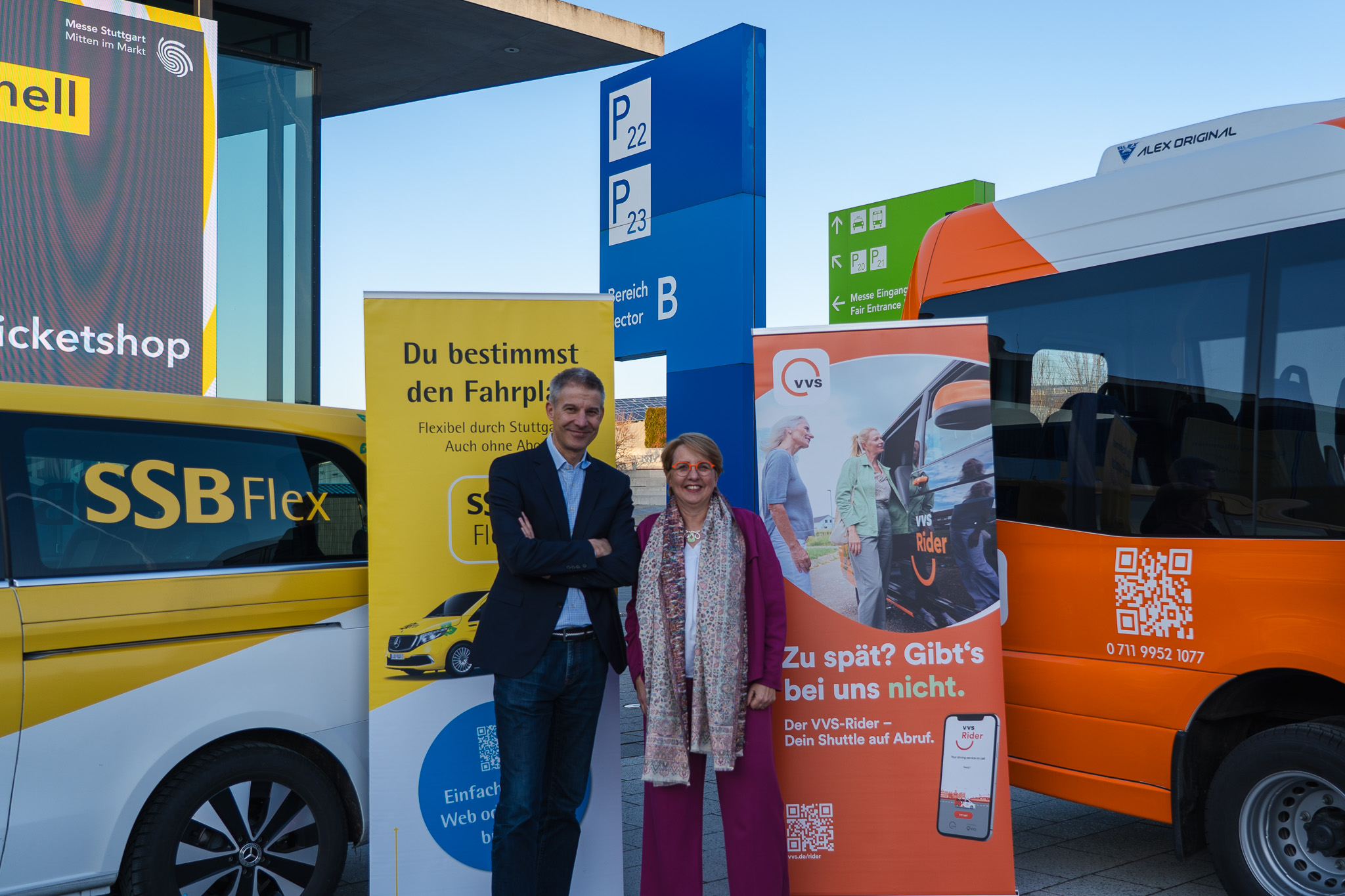 BU: VVS-Geschäftsführerin Cornelia Christian und SSB-Vorstand Mathias Hüske haben anlässlich der CMT die On-Deman-Verkehre VVS-Rider und SSB Flex auf der Messepiazza präsentiert. Der Rider schreibt seit fast 3 Jahren Erfolgsgeschichte. Die Fahrzeuge haben seither 150.000 Fahrten mit rund 1,5 Millionen Kilometer zurückgelegt. Das Angebot bekommt von den Fahrgästen 4,8 von 5 Sternen.